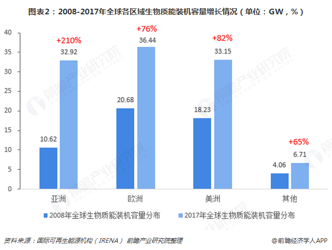 盡管從2008年到2017年歐洲和美洲仍然是全球生物質能裝機第一、第二大市場,但二大市場全球占比卻均有所下降,分別較2007年下降了5.23個百分點和3.67個百分點。亞洲則相反,全球占比十年間上升了10.32個百分點。增速方面,2008-2018年亞洲全球生物質能裝機增長了210%,遠超歐洲的76%以及美洲的82%,亞洲成全球生物質能裝機容量持續穩定增長的主要推動力。