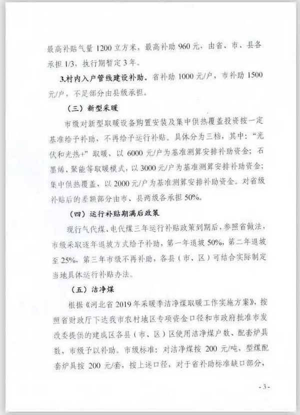 市級對新型取暖設備購置安裝及集中供熱覆蓋投資按一定基準給予補助,不再給予運行補貼。具體分為三檔,其中:“光伏和光熱”取暖,以6000元/戶為基準測算安排補助資金;石墨烯、聚能等取暖模式,以3000元/戶為基準測算安排補助資金;集中供熱覆蓋,以2000元/戶為基準測算安排補助資金。對省級補貼后的差額部分由市、縣兩級各承擔50%。